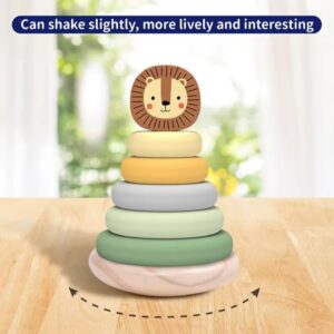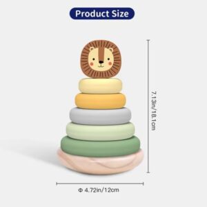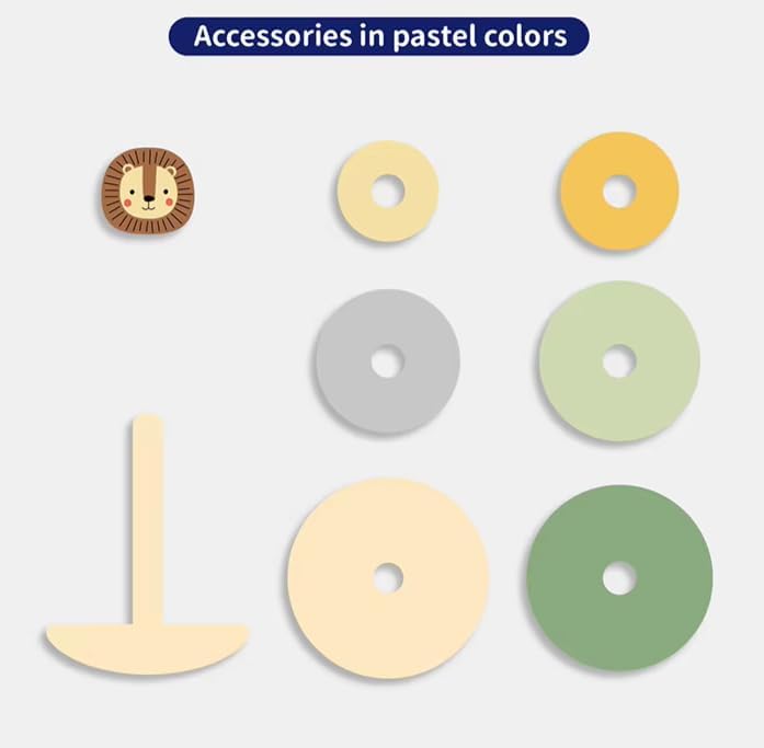 This charming wooden lion stacker toy is designed for toddlers aged 12 months and up, providing an engaging activity for developing fine motor skills and problem-solving. The set includes a friendly lion head topper and six pastel-colored rings in shades of yellow, green, and blue, all resting on a natural wood base. Each ring is smoothly finished, making it safe and easy for small hands to grasp and stack. This toy encourages hand-eye coordination and introduces basic concepts of size and order as children learn to arrange the rings. It’s an ideal gift for young learners, promoting imaginative play and cognitive development in a playful and interactive way. The durable wooden construction ensures long-lasting fun.