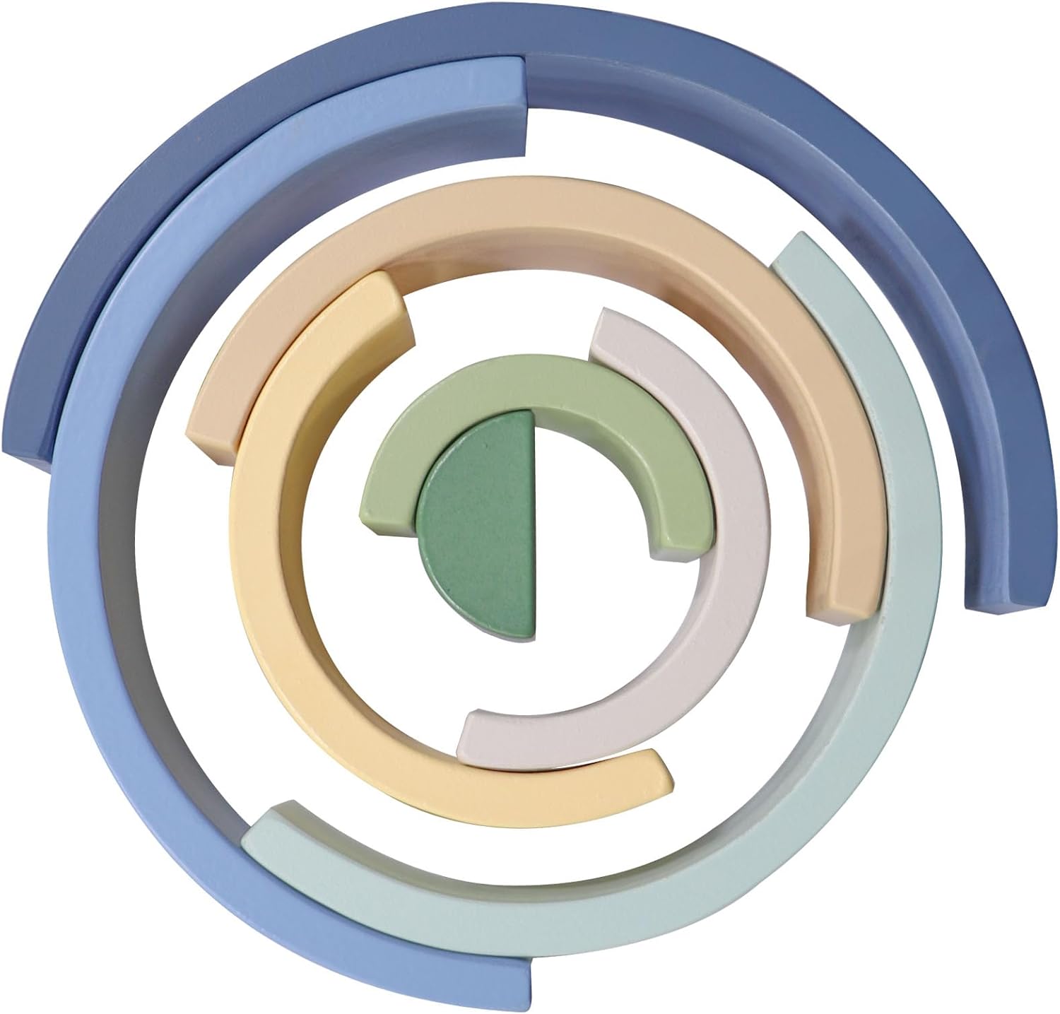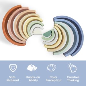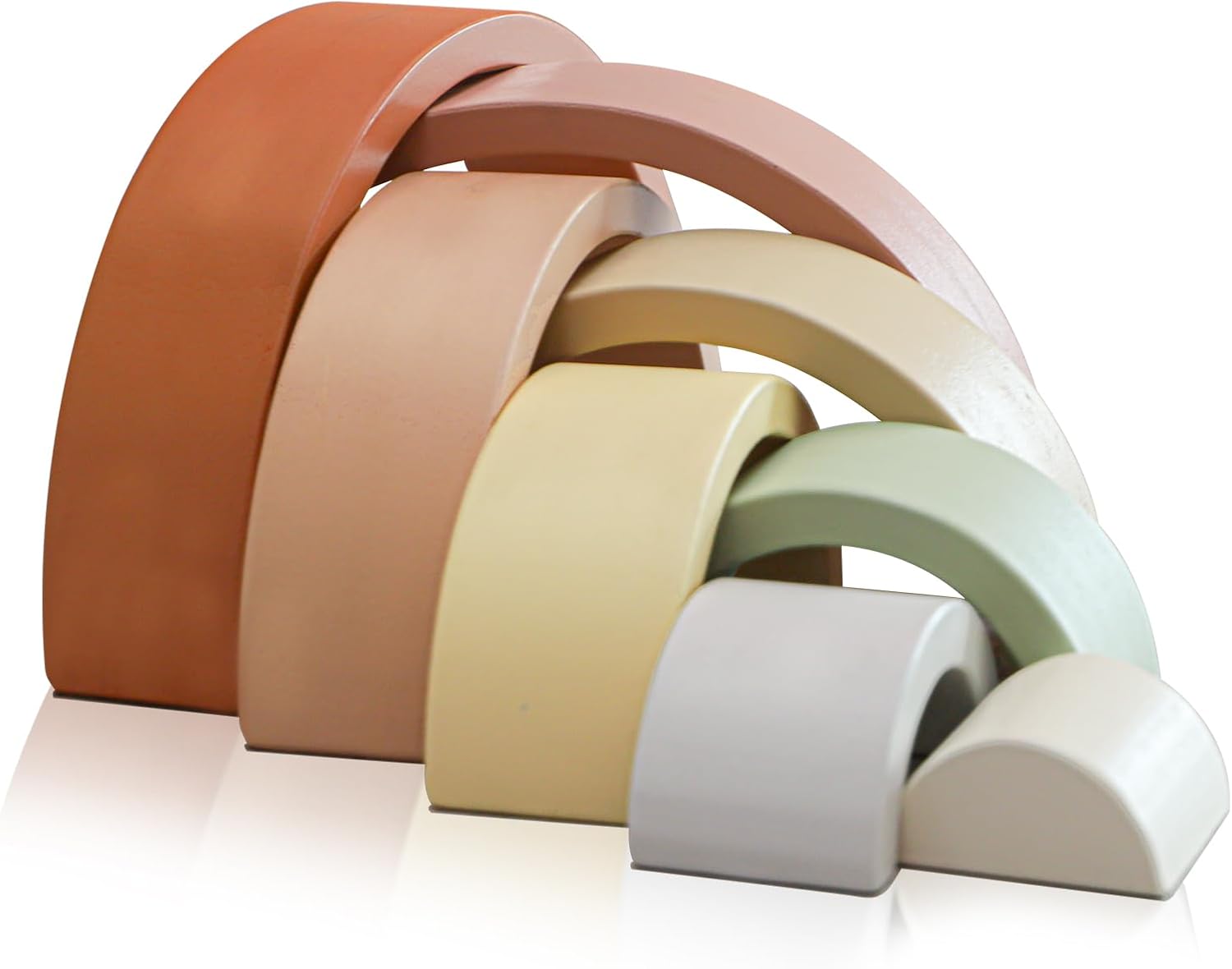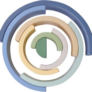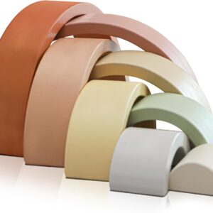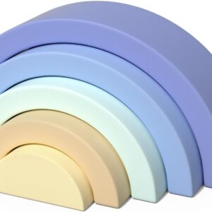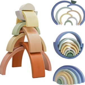 This charming wooden rainbow stacking toy set is designed to engage young children in Montessori-inspired play. The set features multiple arch-shaped blocks in a soothing palette of blues, greens, and yellows, perfect for fostering color recognition and spatial awareness. Each piece is crafted from wood, suggesting durability and a natural feel for little hands. Children can stack, nest, and arrange the pieces in various configurations, promoting fine motor skills, problem-solving, and imaginative play. This versatile toy is ideal for toddlers and preschoolers, offering hours of educational entertainment while supporting cognitive development.